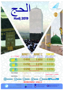 Het Vroeg Boekingsprogramma biedt u de mogelijkheid om een Hadj reis 2019/1440 te vinden die bij u past. Bij Hadjinfo, zijn we altijd op zoek naar manieren om je reis te verrijken. Daarom hebben wij voor deze service gekozen en bieden wij het gemak van het boeken van uw Hadj 2019/1440 veilig bij onze aangesloten en erkende reisbureaus. Of je met een groep bent, of met uw gezin, familie bent, voor iedereen zijn er prachtige en gevarieerde reismogelijkheden en pakketen. Kijk op één van de digitale flyers hiernaast (onder) voor meer informatie over de Hadj reis en neem daarna direct contact op met de betreffende reisbureau ( door op zijn bedrijfsnaam te klikken). Fijn reis!